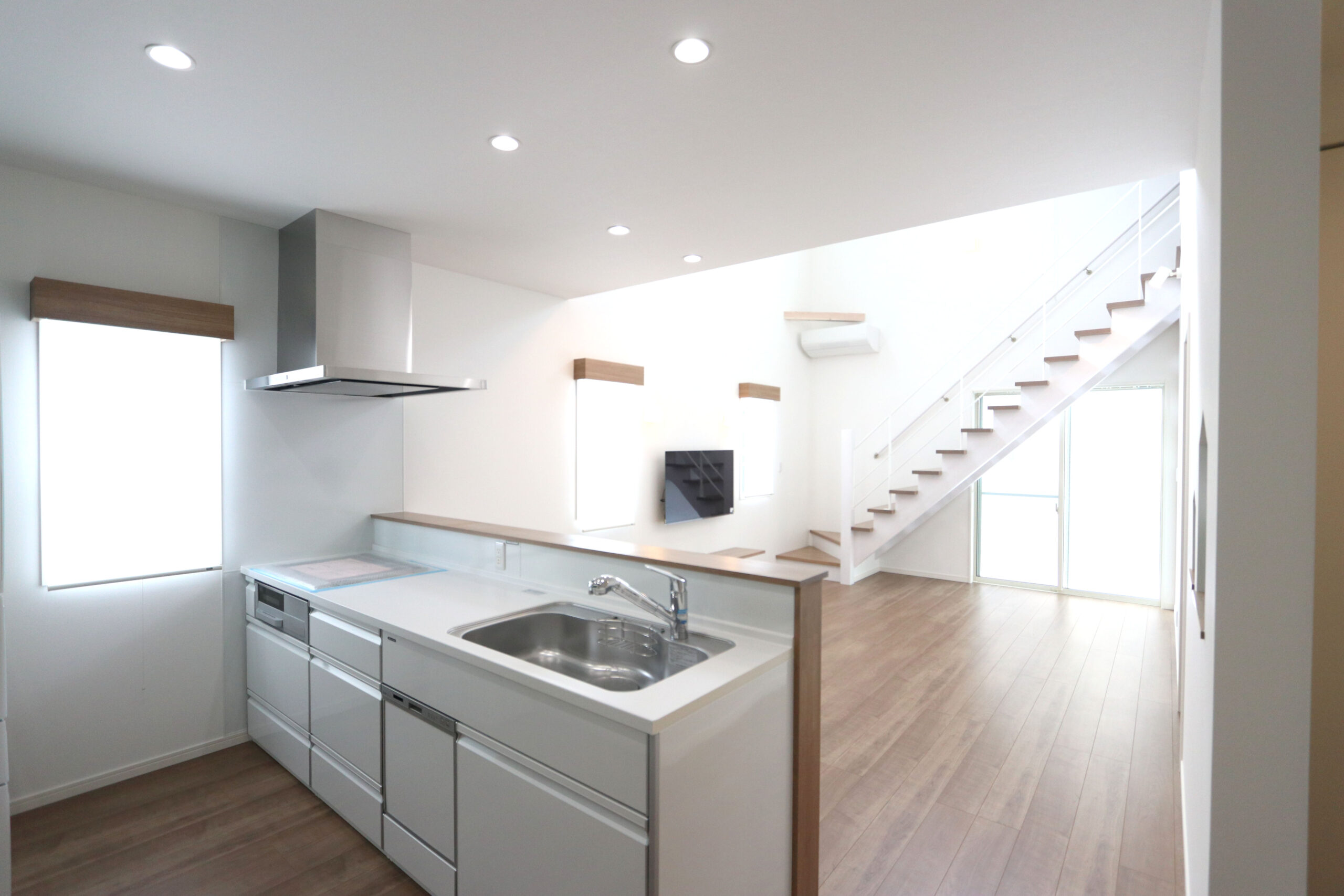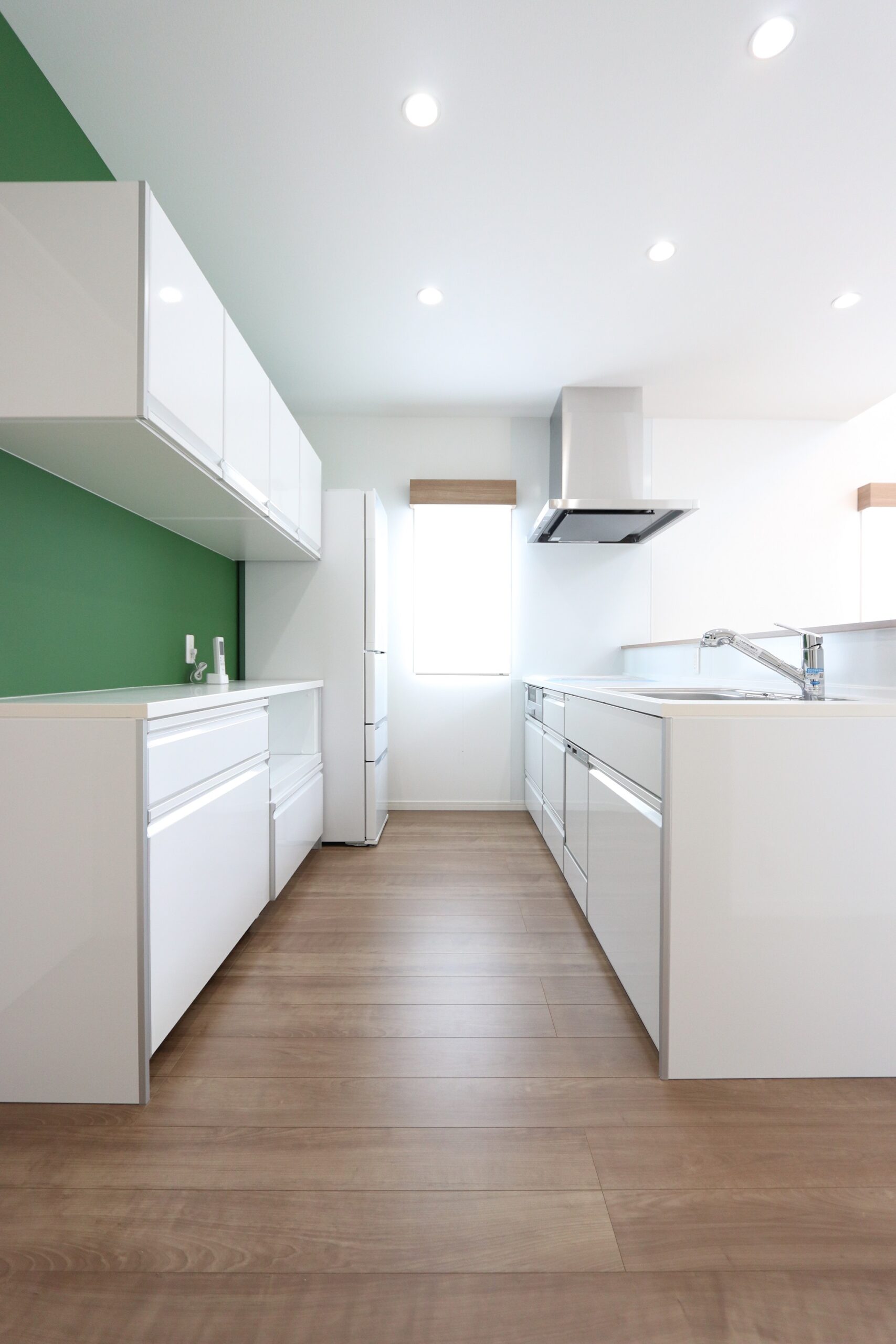 爽やかな白いキッチンとアクセントクロスが相性抜群!