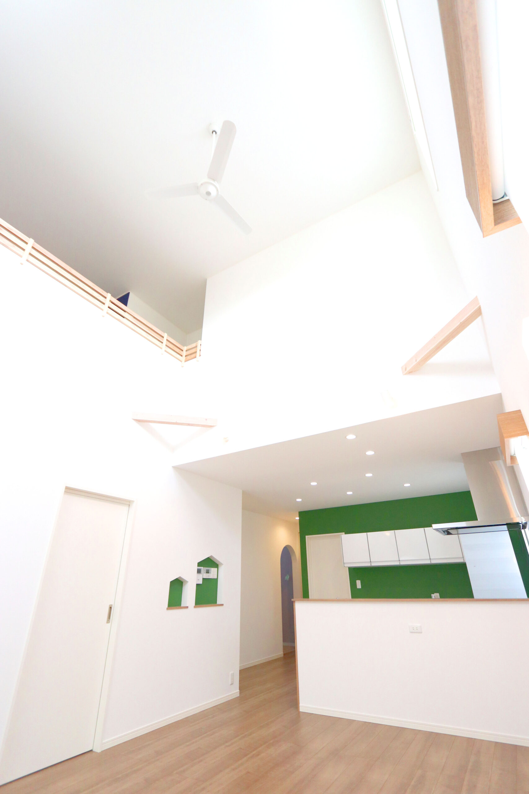 吹き抜けにはシーリングファンも設置して、空調効率UP