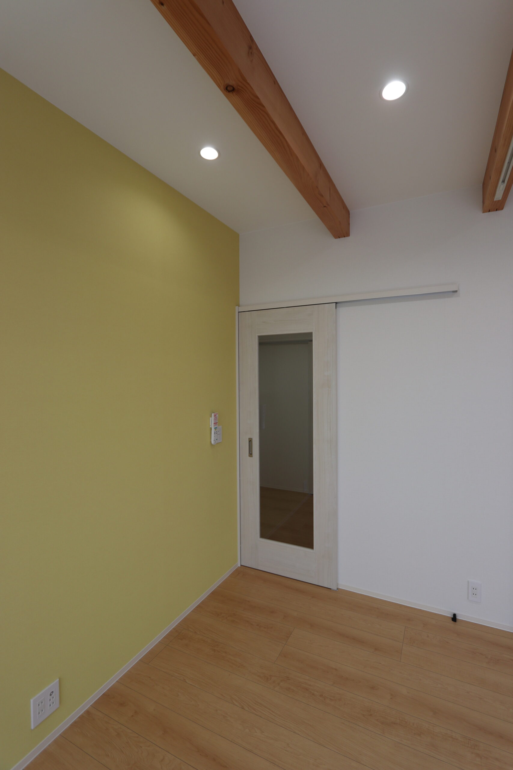 パステルイエローのクロスが印象的な可愛いらしいお家 リビングを2階に設置し、愛犬がご主人の帰りを窓から眺められる間取り リビングの入り口をガラスドアにすることで帰宅を迎えてくれる姿を見ることができ癒される瞬間 愛犬との生活を楽しむ工夫がたくさん詰まった素敵なお家です